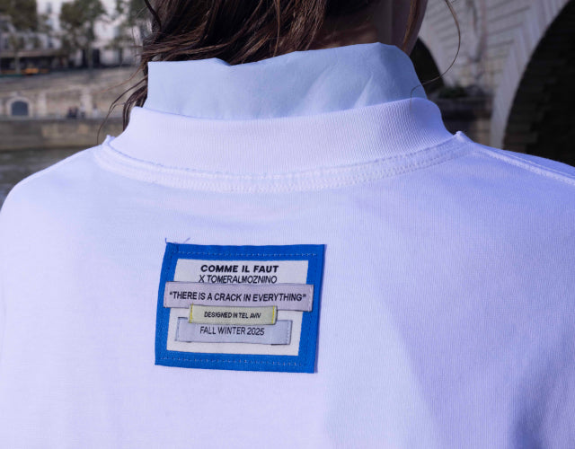 אבל החיים הם לא אינסטגרם, והעבודה על הקולקציה עם תומר נולדה בצל המלחמה. ישבנו בקפה נוגה, דאגנו, כאבנו והשמענו לו את Anthem של לאונרד כהן. השורה There is a crack in everything, That’s how the light gets in תפסה אותנו ולא הרפתה. יצאנו לחפש את הסדקים מתוכם האור יכול להיכנס כשהכל חשוך.